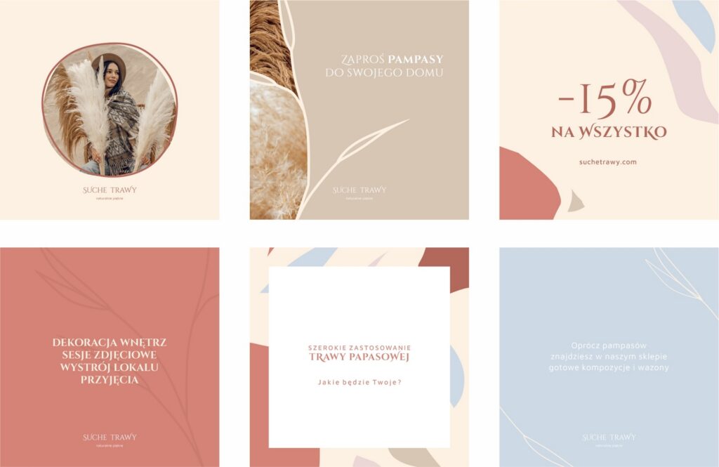 Znak przedstawia fragment trawy pampasowej w dużym przybliżeniu. Okrąg w sygnecie nie jest równy, aby był bardziej naturalny – jak ręcznie rysowany. Zakończenia liter U oraz W nawiązują do pampasów, które otula wiatr delikatnie je przechylając. W ramach budowania nowej kreacji marki powstał spersonalizowany kolaż w kilku wersjach, baner, ulotki oraz szablony postów i stories na social media.